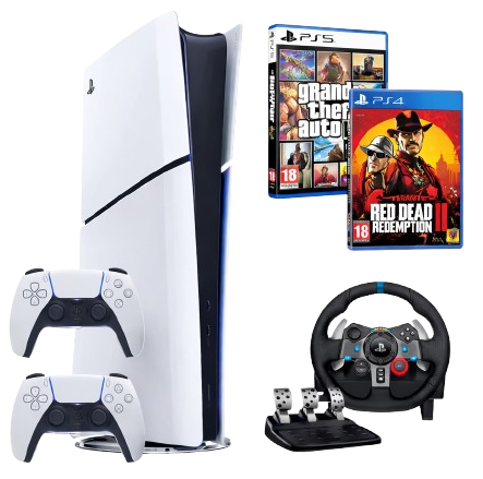 PlayStation 5 bundle featuring the PS5 console, two DualSense wireless controllers, speed box and steering wheel setup, plus two blockbuster games—Grand Theft Auto V and Red Dead Redemption 2—for immersive next-gen gaming.