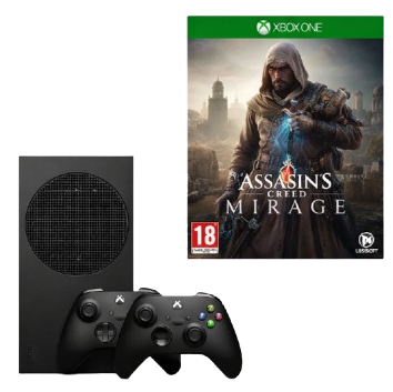 Xbox Series S gaming bundle featuring the compact, high-performance Xbox Series S console, two wireless controllers, and the action-packed title Assassin’s Creed Mirage—perfect for smooth, next-gen gaming in a sleek setup.